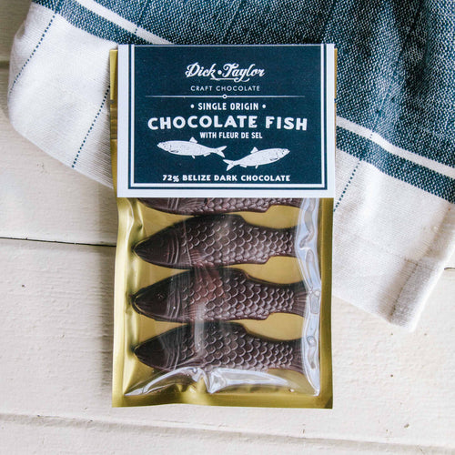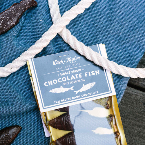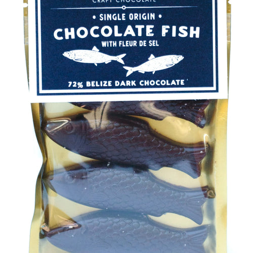 Our Single Origin Chocolate Fish are made in celebration of our coastal home on the historic Humboldt Bay. 72% Belize chocolate is topped with a light sprinkling of Fleur De Sel sea salt, creating the perfect blend of rich dark chocolate and the subtle sharpness of the salty sea air.