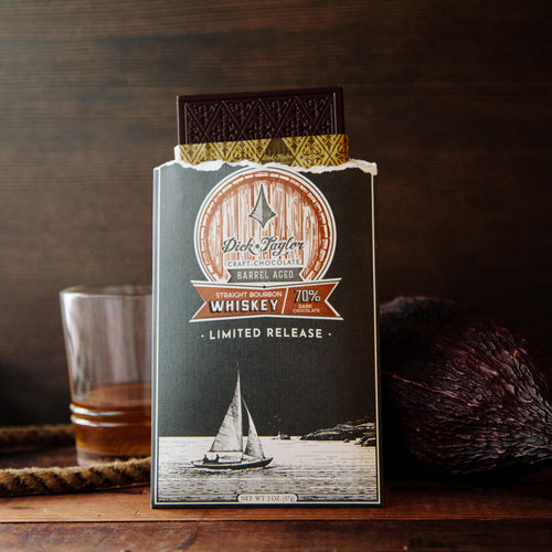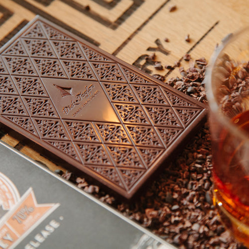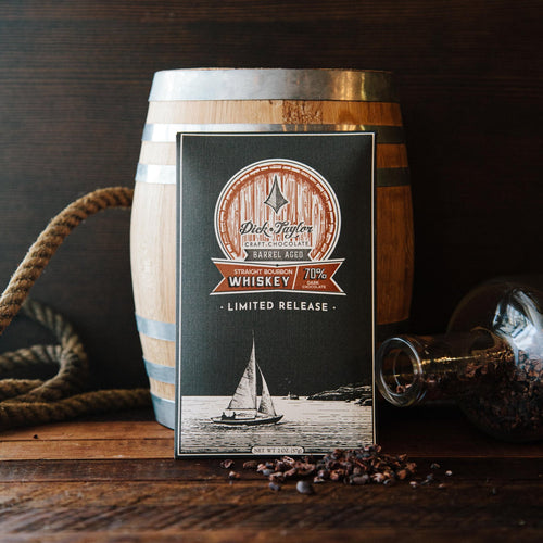 LIMITED RELEASE, 70% DARK CHOCOLATE AGED IN WHISKEY BARRELS